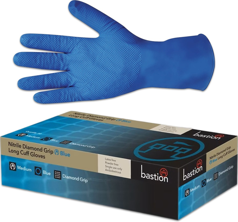 Product: Nitrile Diamond Grip Long Cuff Blue Powder Free Gloves